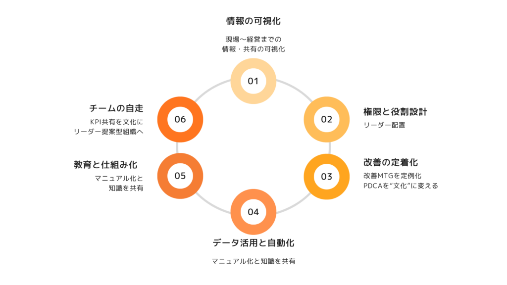 一時的な改善ではなく、現場に定着し続ける仕組み化で、組織全体の成長を支援します。